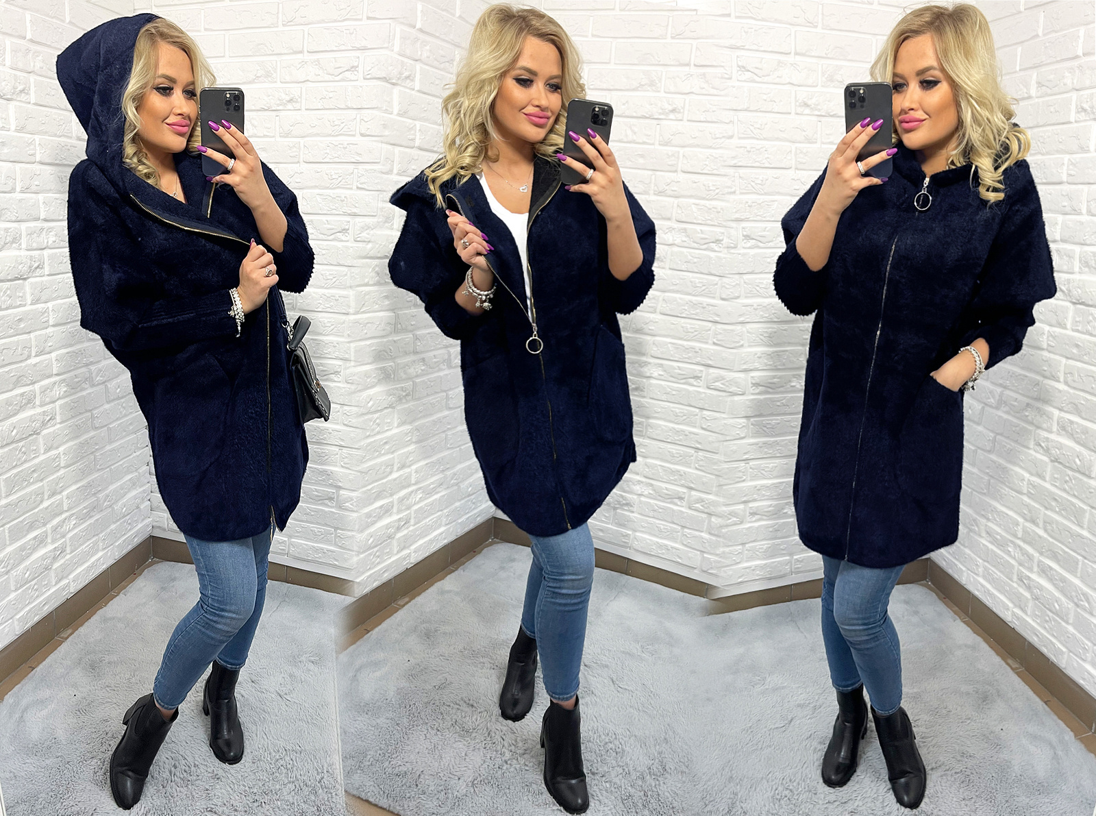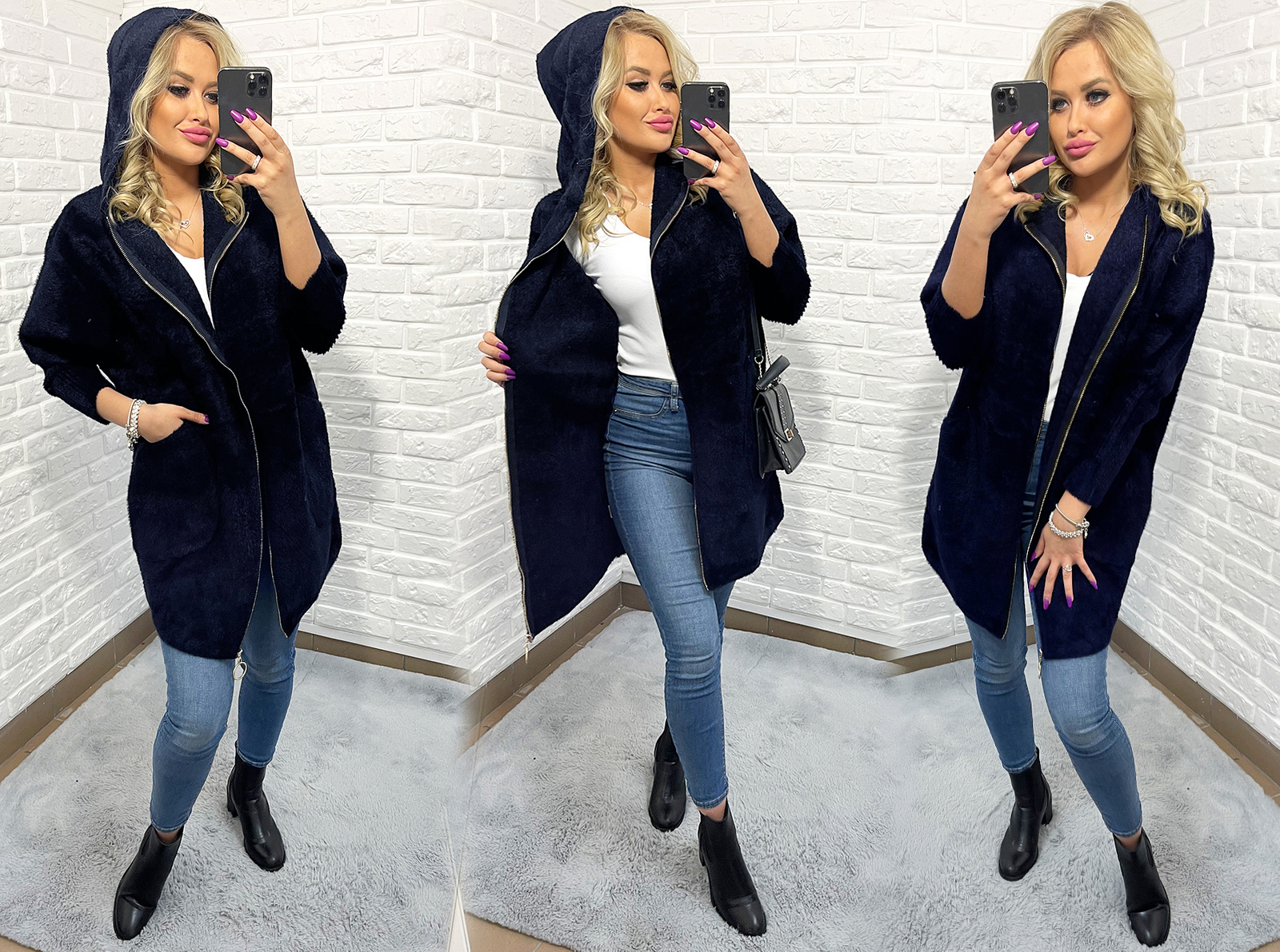 Alpaka Płaszcz z Kapturem Zapinana Na Suwak Wełna Oversize GRANATOWY