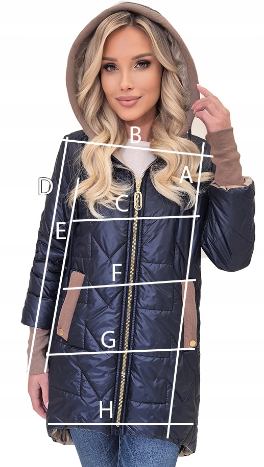 | Rozmiar | A-długość całkowita | B-szerokość w ramionach | C-szerokość od pachy do pachy | D-długość rękawa od ramienia | E-długość rękawa od pachy | F-szerokość w talii | G-szerokość w pasie | H -szerokość na samym dole |
