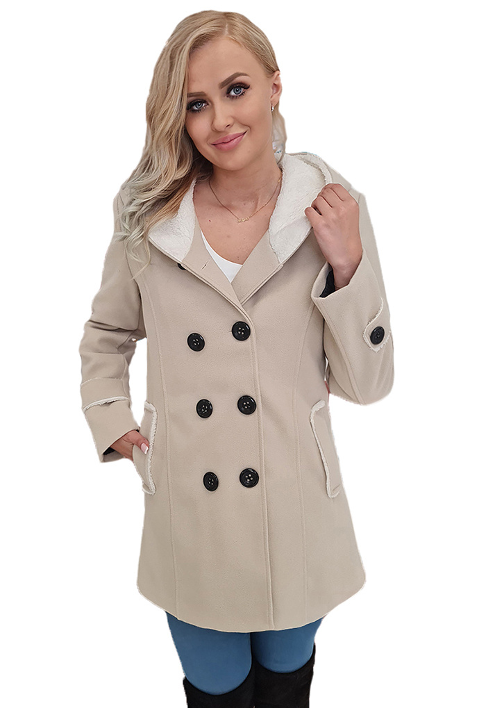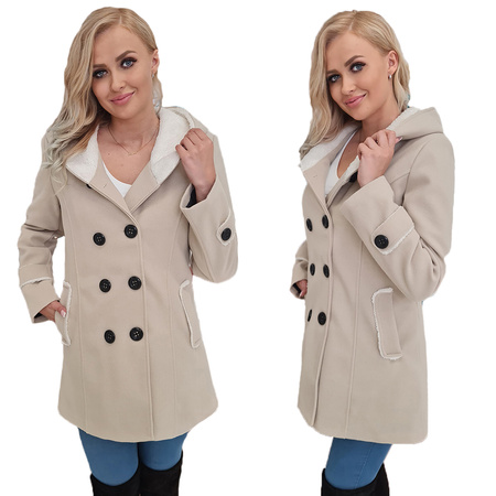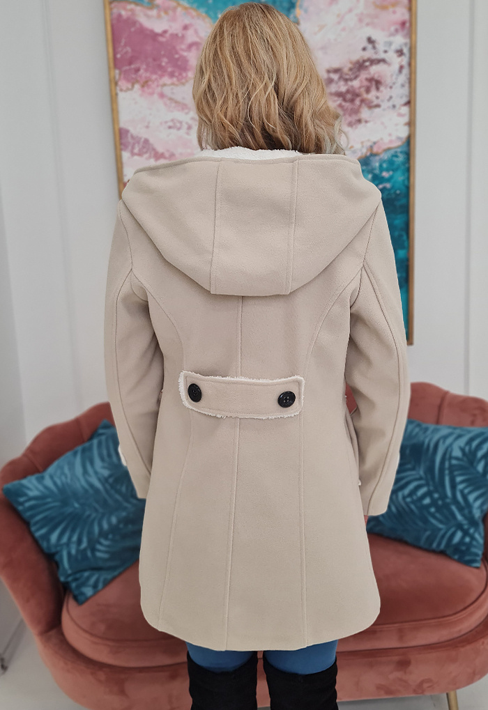 Włoski Płaszcz Z Kapturem Ciepły Z Kożuszkiem BEŻOWY