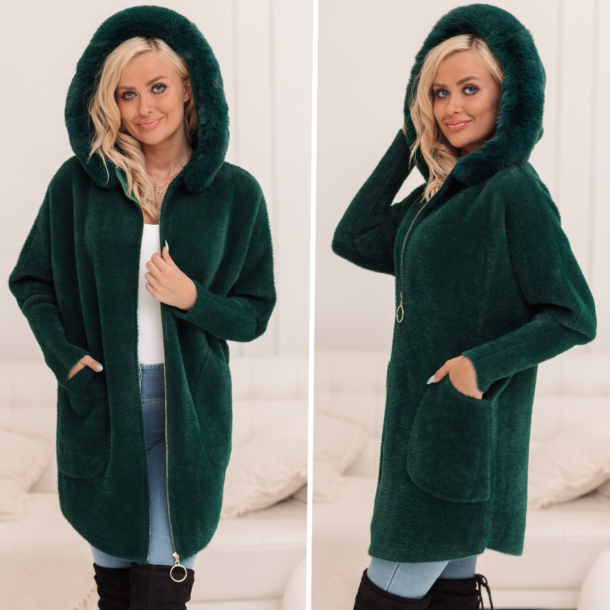 Puszysty i wysokogatunkowy płaszcz ALPAKA, bardzo delikatny i miękki w dotyku. Płaszczyk z kapturem o oversizowym kroju idealnie dopasowuje się do sylwetki.
